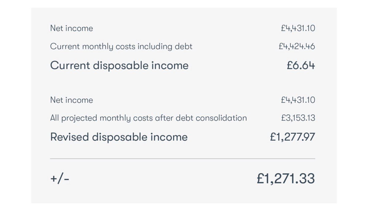 James then assessed the impact of consolidating on the customer’s monthly disposable income and saw that this rose from £6.64 to £1,277.97 and he saved the family a grand total of £45,904 over the duration of all their loans.